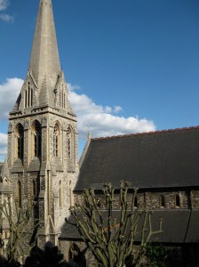 Such as in a tree…Compare/contrast the original view out the window that would inspire me to write, as opposed to after the branch-carnage ensued. At least I still have a perdy church to look at.